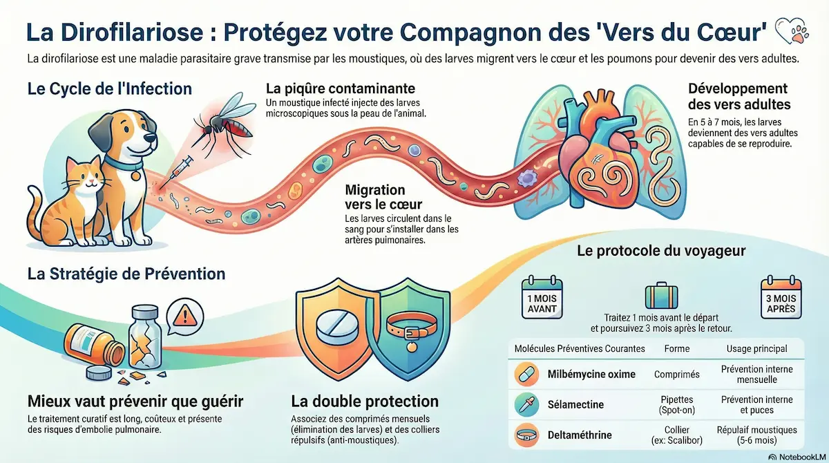 La dirofilariose, aussi appelée “maladie des vers du cœur”, est une maladie parasitaire causée par un ver rond microscopique, Dirofilaria immitis, transmis exclusivement par la piqûre de certains moustiques. Une fois inoculées sous la peau, les larves migrent progressivement dans l’organisme jusqu’au cœur droit et aux artères pulmonaires, où elles peuvent atteindre 25 à 30 cm de long à l’âge adulte. Le chien est l’hôte naturel principal, mais la maladie peut aussi toucher le chat, le furet et, plus rarement, l’être humain. Sans prévention, un chien exposé aux moustiques en zone à risque peut héberger plusieurs dizaines de vers simultanément, sans présenter le moindre symptôme pendant des mois. C’est cette longue période silencieuse qui rend la maladie particulièrement insidieuse.