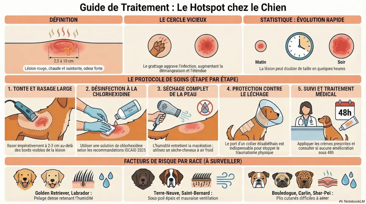 Le hotspot résulte d’une pyodermite superficielle aiguë déclenchée par un facteur initial souvent banal — piqûre de puce, otite, allergie ou humidité persistante — et non d’une infection primaire spontanée. Ce qui le distingue d’une simple plaie infectée, c’est la dimension comportementale : le chien lui-même aggrave la lésion par le léchage et le grattage. Ce mécanisme crée un cercle vicieux — démangeaisons, grattage, infection aggravée, nouvelles démangeaisons — qui explique l’extension spectaculaire de la lésion en quelques heures seulement. Sur le plan neurobiologique, la libération locale de médiateurs inflammatoires (histamine, cytokines) abaisse le seuil de prurit, rendant l’animal incapable de s’arrêter de gratter même lorsque la lésion devient douloureuse. C’est pourquoi l’interruption du comportement de léchage (collier élisabéthain, protection physique) est une composante thérapeutique à part entière, et non un simple accessoire.