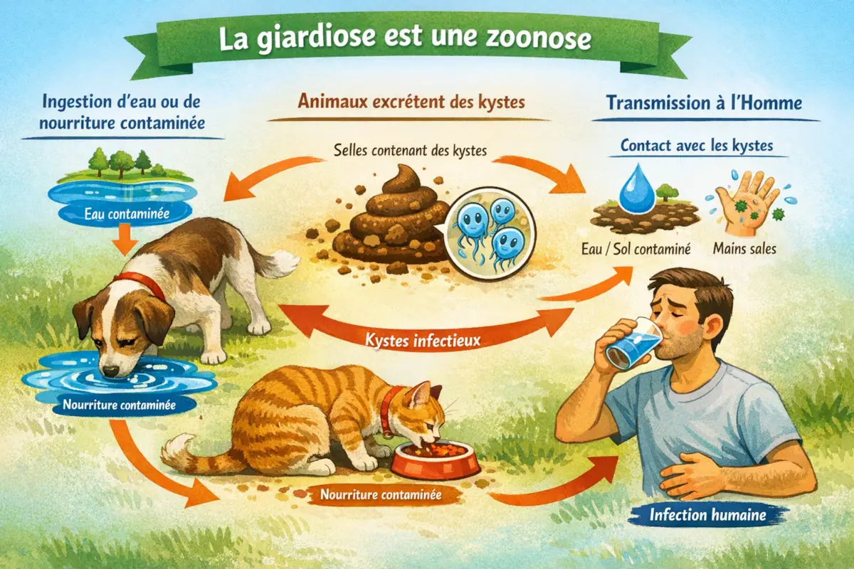 • La giardiose est une zoonose importante : comprenez que cette infection parasitaire peut se transmettre entre les animaux (chiens, chats) et les humains, soulignant l’importance d’une approche de santé unifiée.