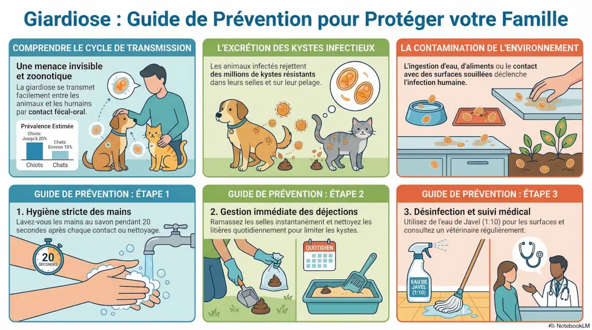 Infographie guide de prévention de la giardiose montrant cycle de transmission, excrétion des kystes, contamination environnementale et mesures d’hygiène chez chien, chat et humain.