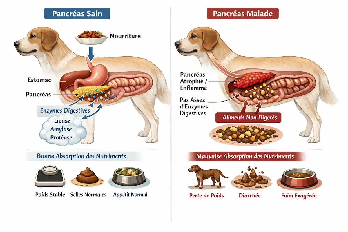 L’IPE est une maladie chronique dans laquelle le pancréas ne produit plus suffisamment d’enzymes digestives (lipase, amylase, protéases), rendant l’absorption des nutriments quasi impossible. Contrairement à une indigestion passagère liée à un repas inadapté, l’IPE est une défaillance organique permanente qui entraîne une malnutrition progressive malgré un appétit souvent excessif. Sans traitement, elle évolue vers un état de dénutrition sévère.