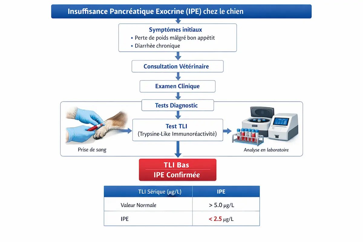 - Le diagnostic de l’IPE repose principalement sur un test sanguin spécifique, le TLI (Trypsin-like Immunoreactivity), qui mesure le niveau des enzymes pancréatiques.