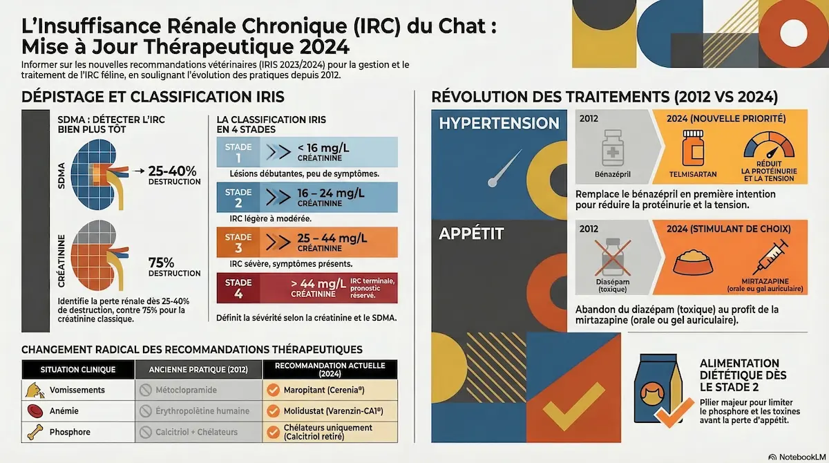 Avant de détailler les traitements, il est essentiel de comprendre la classification IRIS, qui divise l’IRC en 4 stades selon la concentration de créatinine dans le sang et le marqueur SDMA :