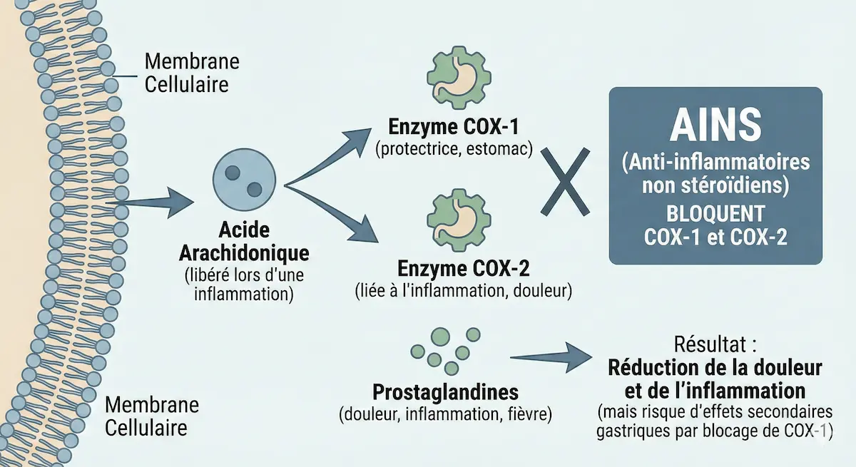 Schéma du mécanisme de l’inflammation montrant l’acide arachidonique, les enzymes COX-1 et COX-2, les prostaglandines et l’action des AINS.