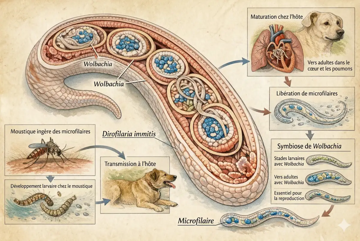 Les bactéries Wolbachia vivent à l’intérieur du ver du cœur, Dirofilaria immitis, et sont indispensables à son développement et à sa fertilité. Sans ces bactéries, les larves se développent mal et les vers adultes se reproduisent beaucoup moins. À chaque étape du cycle (larves dans le moustique, migration dans le chien, vers adultes dans le cœur, microfilaires dans le sang), Wolbachia accompagne le parasite. Cette dépendance fait de la bactérie une cible de choix : en la supprimant, on affaiblit indirectement le ver lui‑même. C’est ce qui explique l’intérêt croissant pour des traitements qui visent d’abord Wolbachia plutôt que le ver seul.