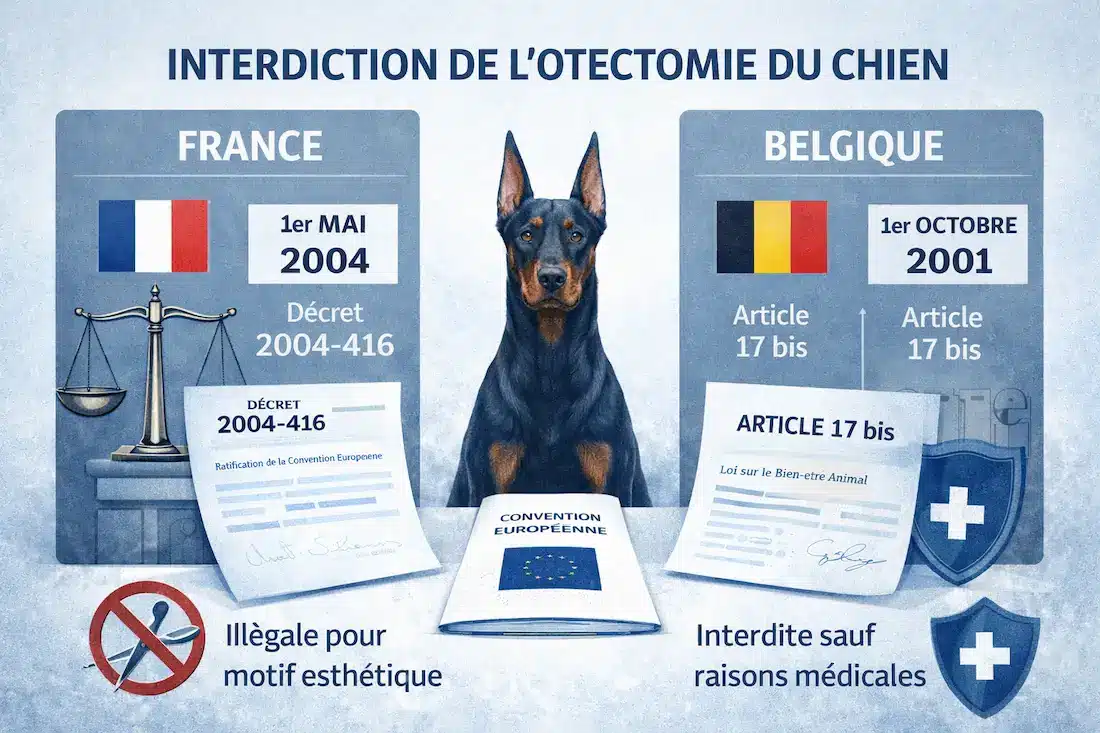 Dans la plupart des pays européens, la coupe des oreilles pour motif purement esthétique est interdite par les lois sur le bien‑être animal (au même titre que la caudectomie de convenance). Elle ne reste envisageable que pour des raisons médicales justifiées (tumeur, nécrose, traumatisme) et dans un cadre strictement vétérinaire.
