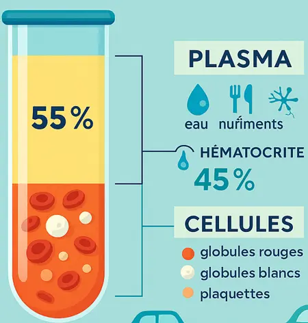 Ces proportions bougent un peu selon l’hydratation (déshydratation = hématocrite qui monte), l’altitude et l’âge. En bref, le plasma est la “route”, les cellules sont les “véhicules” qui circulent dessus.