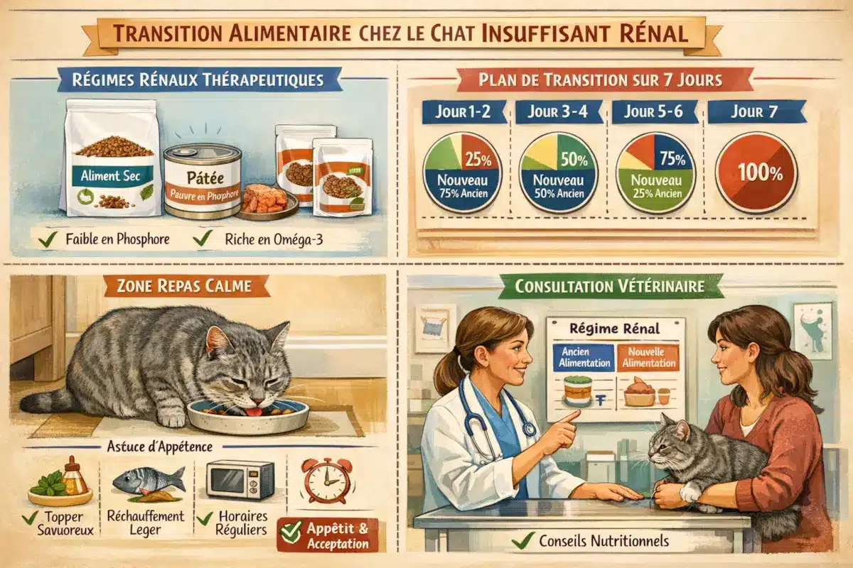 Transition alimentaire régimes rénaux chez le chat avec plan sur 7 jours et conseils vétérinaires