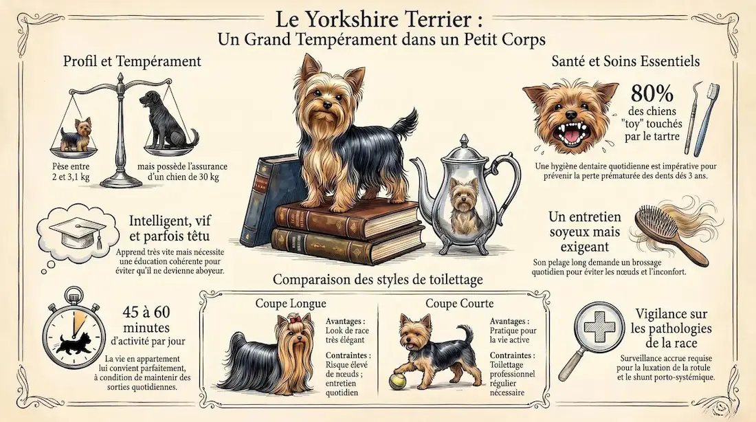 Le yorkshire terrier est un petit chien vif, affectueux et intelligent, mais il demande un vrai suivi en santé, en toilettage et en éducation. Malgré sa taille, ce n’est pas un chien “sans contraintes” : il a besoin d’une routine claire, d’un brossage fréquent, d’une attention dentaire sérieuse et de sorties quotidiennes pour rester équilibré.